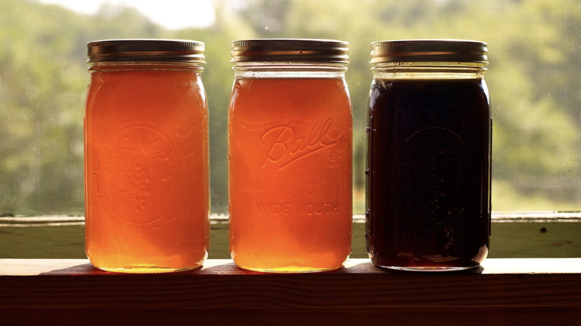 Lighter spring honey in the two jars on the left. The dark fall honey makes the best ice cream!