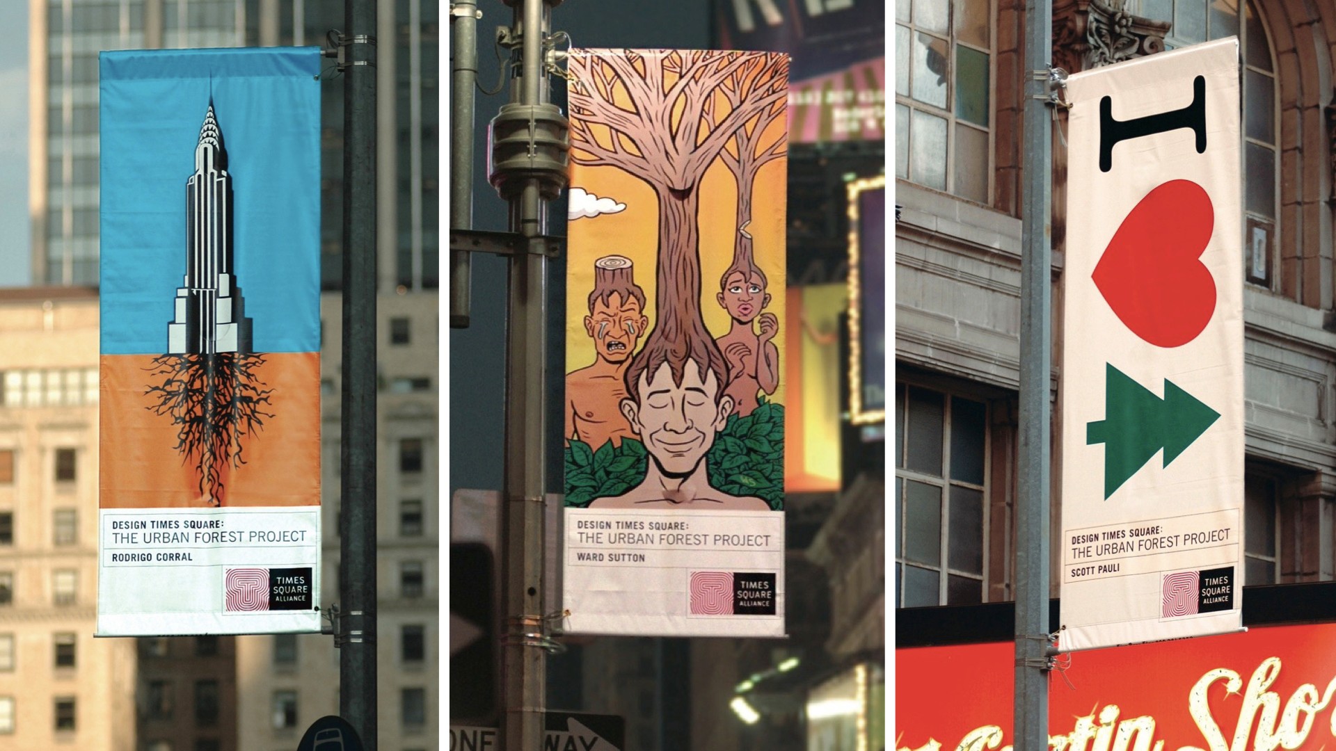 Banners in Times Square (left to right) by Rodrigo Corral, Ward Sutton and Scott Pauli.