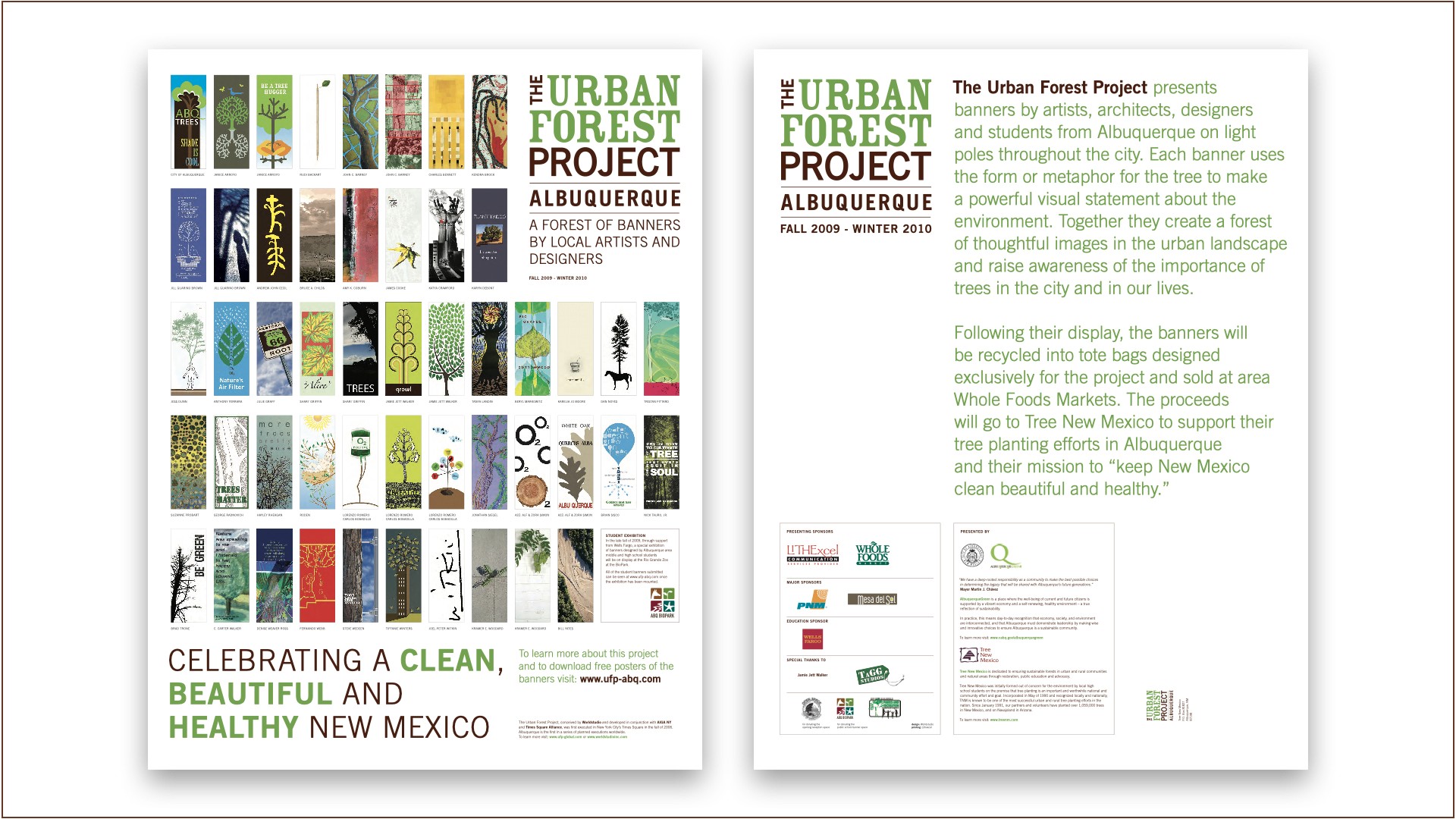 The Urban Forest Project is a unique public arts initiative, which invited local artists and designers to employ the idea or form of the tree to make a powerful visual statement on street-banners that were then displayed in their community. The tree is a metaphor for sustainability and in that spirit, the banners at the close of each exhibition were recycled into totebags and auctioned off to raise money for a local environmental cause.
